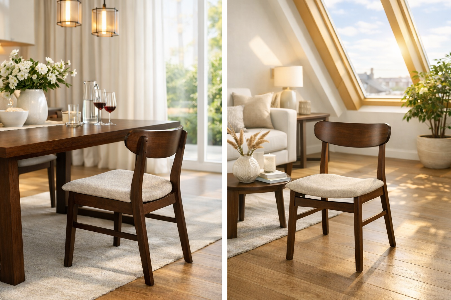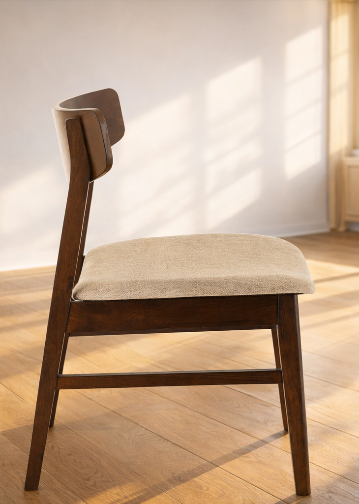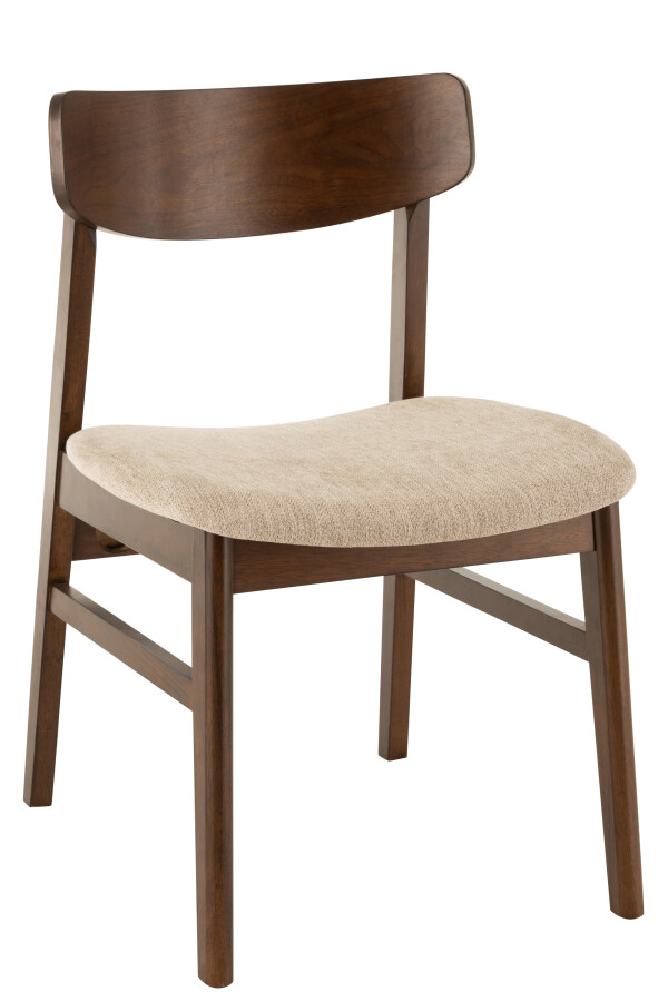 Židle z masivního kaučukového dřeva s jemně zaobleným opěradlem a pohodlným čalouněným sedákem v béžové látce. Kombinuje klasický tvar s moderním zpracováním, ideální do klasických i luxusních interiérů, kde vynikne její nadčasový design.