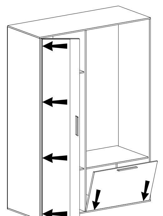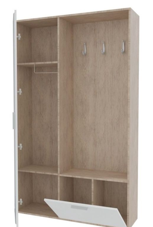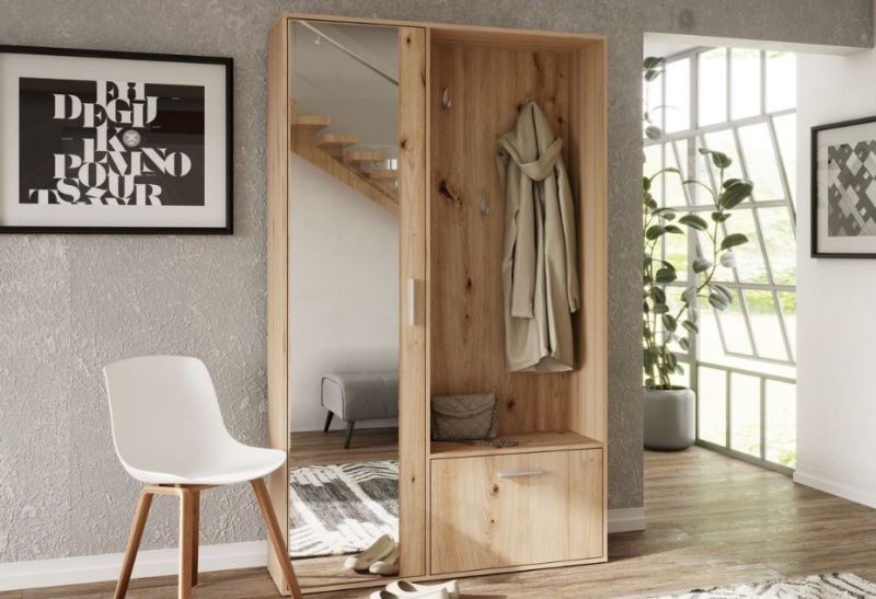 Moderní předsíňová stěna z kvalitní lamina v barvě - dub artisan. Sestava se skládá z věšákového panelu, výklopného botníku a šatní skříně se zrcadlem ( uvnitř 2 police a šatní tyč ).