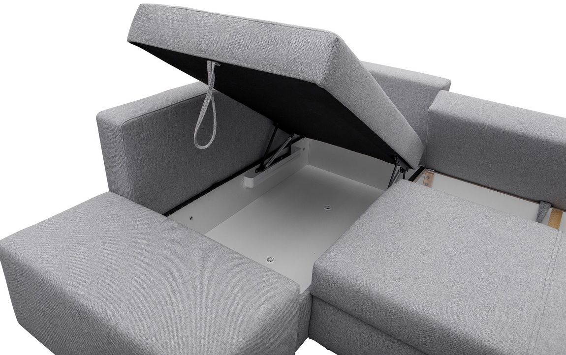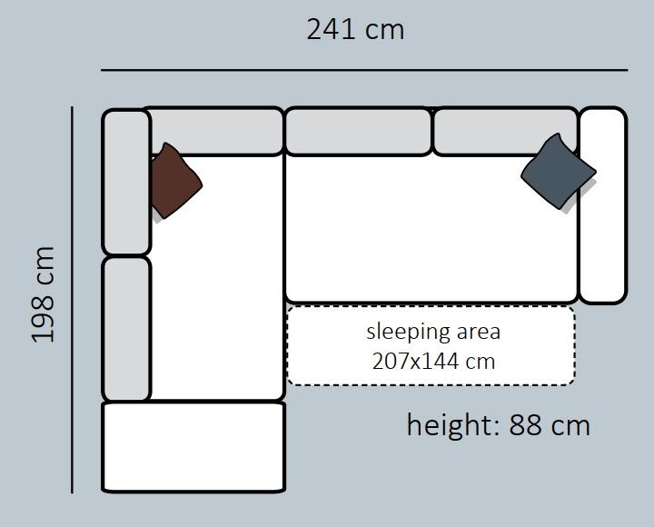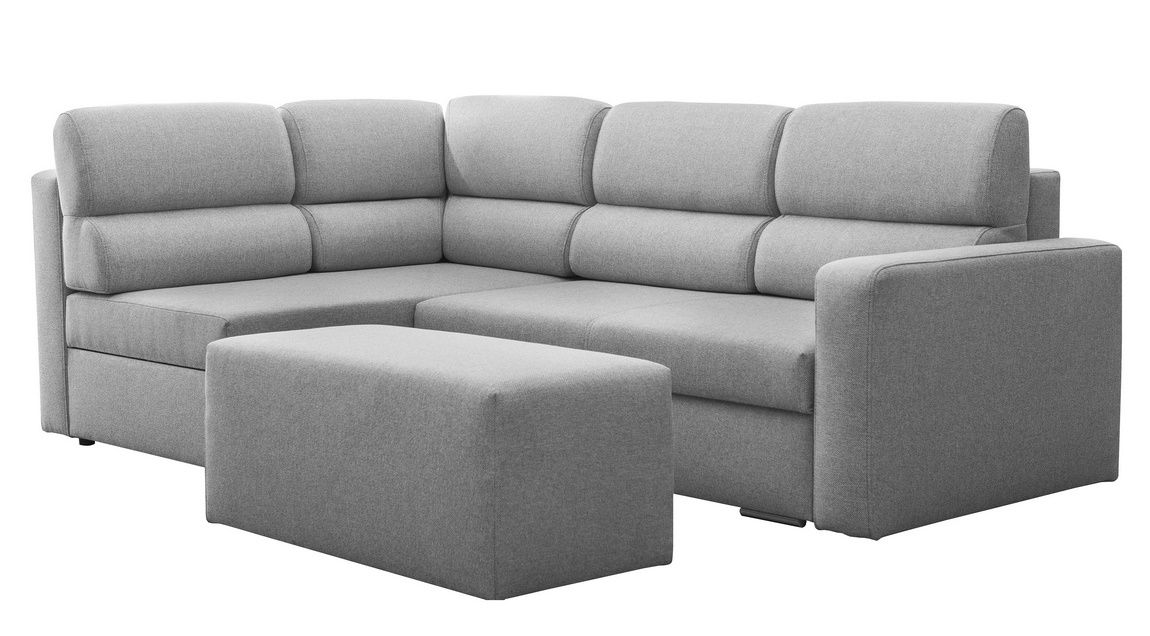 Praktická čalouněná , v moderním provedení s praktickým taburetem v ceně sedačky. Sedačka obsahuje úložný prostor a prostor na příležitostní spaní. Po rozložení je spací plocha 207 x 144 cm. Výška sedu je 44 cm. Pohodlné sezení zaručují bonelové pružiny s PUR pěnou. Barevné provedení - světle šedá látka.