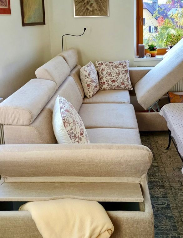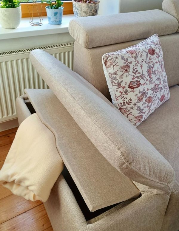 Sedačka má velký úložný prostor v lenošce a také praktický malý úložný prostor v područce (peřináč).