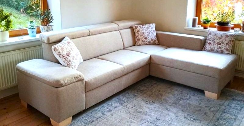 Rohová sedačka Roma (pravé provedení) s lenoškou, polohovatelnými opěrkami hlavy, rozkladem a úložným prostorem.