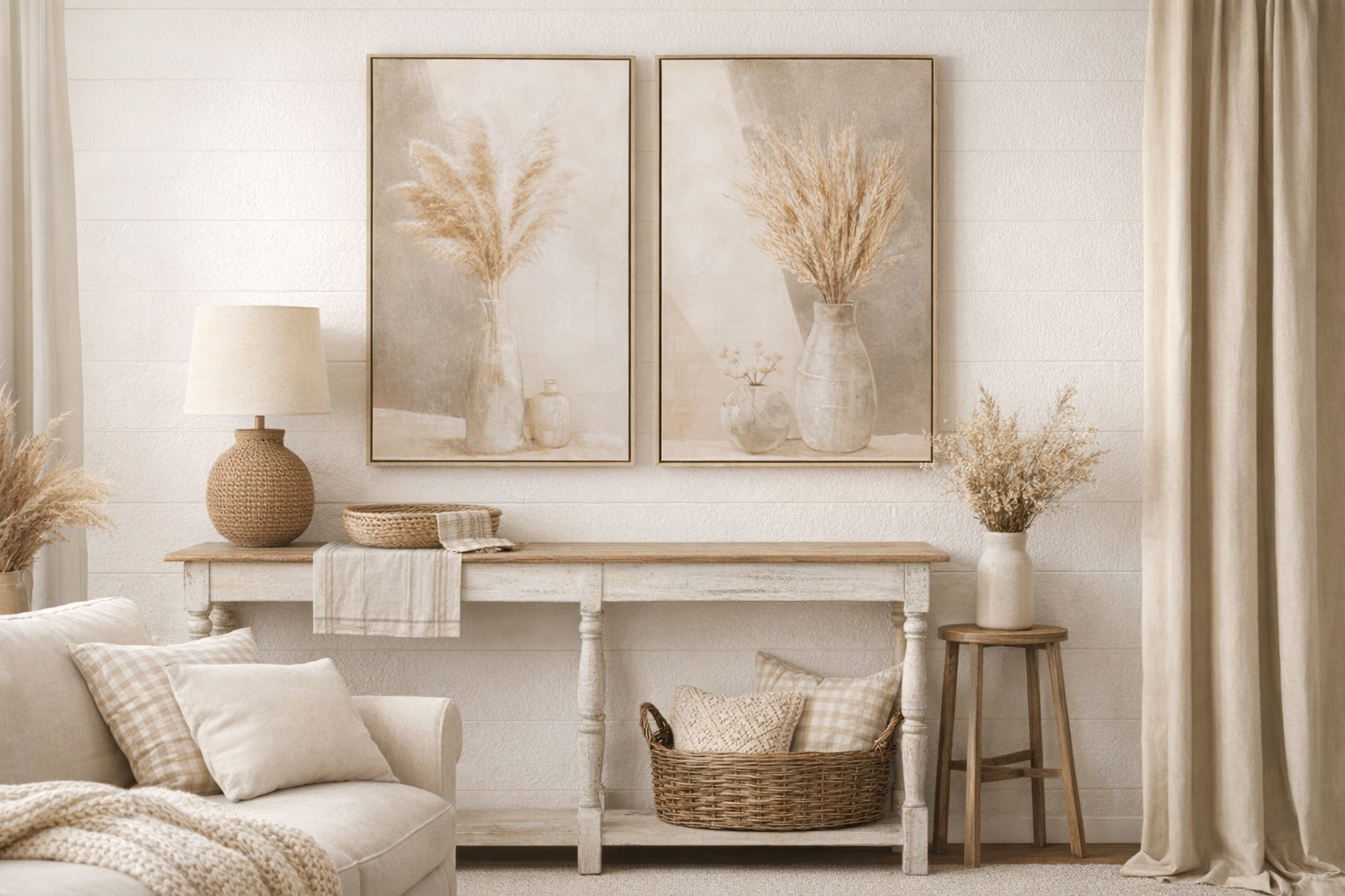 Neutrální barvy se snadno kombinují a obrazy vytvářejí příjemnou atmosféru v obýváku, ložnici i předsíni.