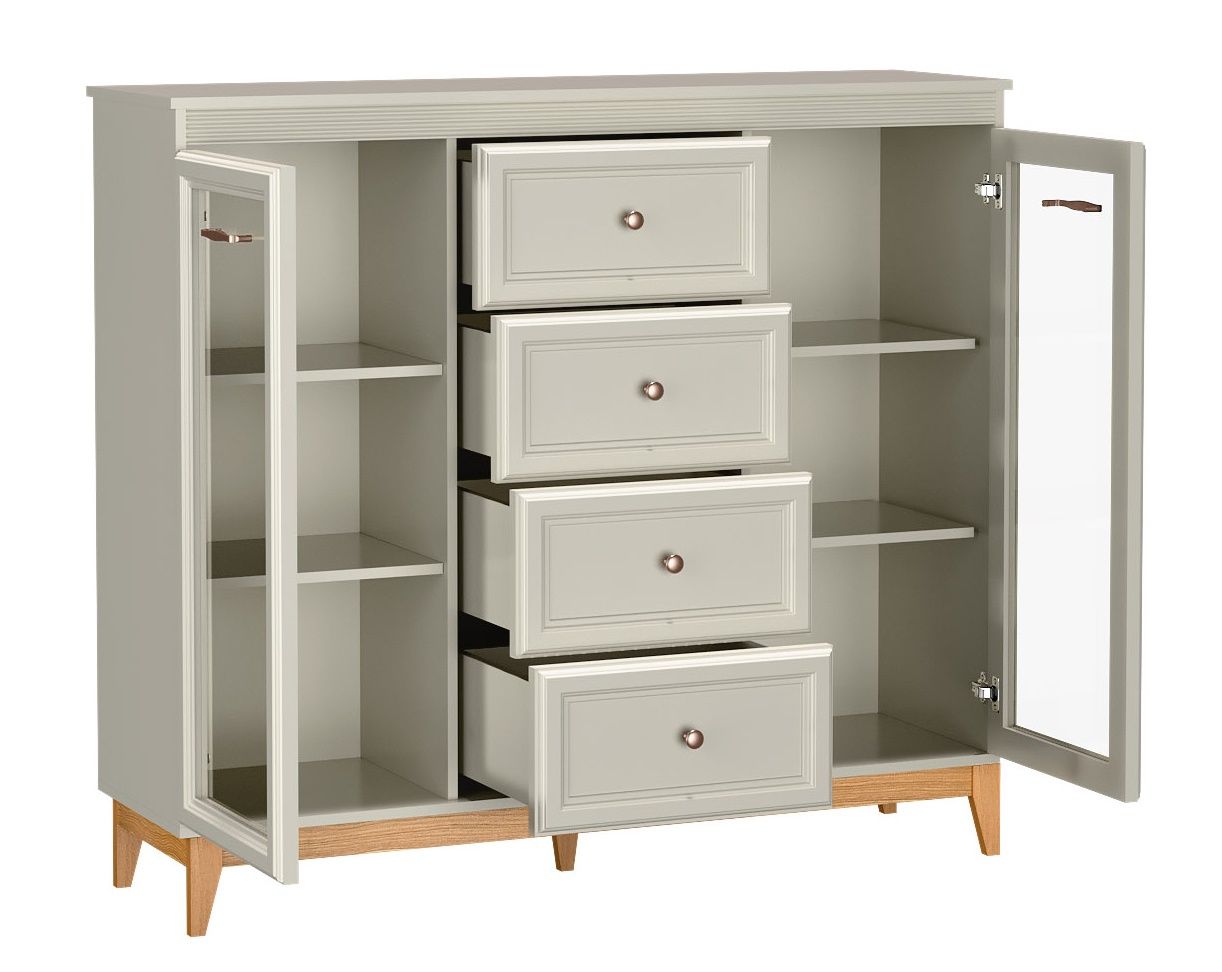 Elegantní vitrína v moderním pojetí klasického řemesla.Teplo přírodního dřeva doplňuje jemný kašmírový odstín (béžová s nádechem šedé), který krásně zapadne do klidných a harmonických interiérů.Jemné frézování, MDF lišty, minimalistické kovové úchyty a vyvážené proporce dodávají nábytku nadčasový charakter. Praktické uspořádání – čtyři zásuvky a dvě prosklené skříňky s policemi – zajistí pořádek i přehled. Tiché dovírání výsuvů a pantů přináší každodenní komfort.Vitrína stojí na pevných dubových nožkách (15 cm). Korpus z odolného lamina a MDF čela s ABS hranami zaručují dlouhou životnost.Dodáváme v demontovaném stavu.Na objednávku do cca 3 - 4 týdnů.Sedačky a nábytek nezasíláme přepravní službou. Preferujeme osobní návštěvu u nás na prodejně, kde je možné si vše v klidu prohlédnout a vyzkoušet. V případě zájmu o koupi, zajistíme kompletní servis — dovoz, výnos, vybalení i umístění na místo. Cena služby se odvíjí od vzdálenosti a náročnosti výnosu a dalších požadavků.